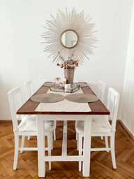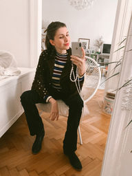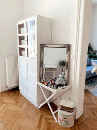 Wie man an den Bildern der verschiedenen Wohnungen sehen kann, sind mit denselben Möbeln über die Jahre immer wieder neue Räume entstanden. Denn genau wie wir selbst, darf sich auch ein Zuhause verändern – und mit den eigenen Bedürfnissen mitwachsen. Schon als Kind liebte ich es, Räume zu gestalten – ob im Barbiehaus, mit Lego Belville oder bei den Sims. Mein Kinderzimmer im Burgenland wurde schnell zur Spielwiese für meine Kreativität: Inspiriert von der Designerin Laura Ashley verwandelte ich es in ein pastellfarbenes Blumenmeer mit weißem Himmelbett, verschnörkelten Details und den blau gestrichenen Erbstücken meiner Großeltern. Als ich mein erstes WG-Zimmer in Mödling bezog, wollte ich einen ähnlichen, aber etwas prunkvolleren Stil fortführen. Ich übernahm die Möbel, die meine Familie entbehren konnte, strich sie in der damaligen Trendfarbe Weiß und kombinierte sie mit Blümchenstoffen, silbernen Bilderrahmen mit Rosendetails und lila Glitzerwänden – für eine ordentliche Portion Prinzessinnen-Charme. Nur ein Jahr später fanden sich diese Möbel stilvoll inszeniert im nächsten WG-Zimmer in Wien wieder. Ein größeres Bett und ein passender Kasten kamen hinzu, und so entwickelte sich auch mein Stil ganz organisch weiter. Mit 25 erfüllte ich mir einen großen Traum: Ich bezog zum ersten Mal allein eine Altbauwohnung – mit Fischgrätboden, weißen Flügeltüren und genau dem Charme, den ich mir immer gewünscht hatte. Die weiß gestrichenen Möbel passten perfekt hinein und wurden ergänzt durch restaurierte Stücke aus dem Keller meiner Eltern, ein paar neue, trendige Möbel wie ein pastellblaues Sofa und echte Pflanzen, die nach und nach die Zierblumen ersetzten. Mein Stil wurde ruhiger und natürlicher – ohne seinen Zauber zu verlieren. Seit 2021 lebe ich mit meinem Partner Philipp in einer modernen Dachgeschosswohnung, die du bereits oben gesehen hast – ein Zuhause, in dem fast all unsere alten Möbel erneut Platz gefunden haben. Auch wenn ich heute naturbelassenes Holz, sanfte Töne und klare Linien bevorzuge, habe ich die bestehenden Stücke mit Naturelementen, vielen Pflanzen und gezielten Ergänzungen neu interpretiert. So entstand ein Zuhause, das nicht nur ästhetisch ist, sondern auch nachhaltig, persönlich und zeitgemäß.