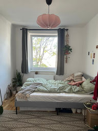 Magdalenas Zuhause war zum Zeitpunkt der Umgestaltung bereits voller schöner Dinge: Secondhand-Möbel, Deko aus früheren Wohnungen und Erinnerungsstücke aus aller Welt – teils selbst gesammelt, teils kurz zuvor gemeinsam auf Willhaben entdeckt. Doch sie fühlte sich in den neuen Räumen noch nicht so richtig wohl. Durch die willkürliche Platzierung all dieser Stücke wirkten die Räume eher unruhig, etwas leer und zugleich stellenweise überladen. Deshalb bat sie mich, mal einen Blick darauf zu werfen. Wir haben gemeinsam überlegt, in welche Richtung es gehen soll, was bleibt, was wohin gehört – und was vielleicht einfach nicht mehr gebraucht wird. Anschließend haben wir die gesamte Deko aus den Räumen genommen, um mit einem frischen Blick auf die vorhandene Struktur zu schauen. Die Möbel wurden teilweise neu arrangiert, einzelne Stücke neu gruppiert und die Proportionen überdacht. Der große Teppich im Schlafzimmer bekam einen neuen Platz, um mehr optische Ruhe und Struktur zu schaffen, und die dunklen Vorhänge wurden entfernt – was die beiden kleinen Räume sofort heller und luftiger wirken ließ. Dann ging es an die Gestaltung der liebevollen Details. Magdalena hatte nicht nur viele dekorative Lieblingsstücke in ihren Räumen verteilt, sondern auch noch weitere Schätze, die bislang keinen richtigen Platz gefunden hatten. Ihr Wunsch: dass all diese Döschen, Schälchen, Kerzen, Pflanzen, Bilder und Plakate sichtbar sind und zur Geltung kommen – ohne dass dabei visuelle Unruhe entsteht. Mit einem feinen Gespür für Ordnung, Wirkung und Balance habe ich all diese Stücke neu sortiert, sinnvoll ergänzt und stimmig arrangiert, sodass die Räume ihre Persönlichkeit widerspiegeln und gleichzeitig Ruhe ausstrahlen. Aus einem Schlafzimmer und einem kleinen Ess-/Arbeitsbereich wurden so im Jahr 2023 – ganz ohne Neukäufe – in nur wenigen Stunden Räume, die sich für Magdalena endlich wie ein echtes Zuhause anfühlen: gemütlich, lebendig und dennoch klar.