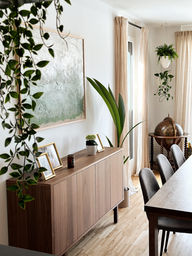 Als mein Partner Philipp und ich 2020 noch in getrennten Wohnungen lebten, hätten unsere Einrichtungsstile kaum unterschiedlicher sein können. Während er eine Vorliebe für schwarze Möbel und kräftige Farben hatte, war meine Einrichtung geprägt von hellen Tönen, pastelligen Akzenten und weißen Möbelstücken. Was uns jedoch von Anfang an verbunden hat, war die Wertschätzung für Möbel mit Geschichte: Erbstücke aus unseren Familien, die Charakter und Tiefe in einen Raum bringen und ihn einzigartig machen. Auch bezüglich der gewünschten Atmosphäre waren wir uns schnell einig – hochwertig, minimalistisch und gemütlich sollte es sein. Auf dieser Grundlage entwickelte ich ein Einrichtungskonzept mit natürlichen Materialien, das unsere individuellen Stile zusammenführte und (fast) alle unsere bestehenden Möbel integrierte. Durch gezielt eingesetzte Kontraste, viele Pflanzen und einen harmonischen Mix aus Alt und Neu entstand ein stimmiger Look, der nicht nur ästhetisch funktioniert, sondern bis heute die Basis für unseren liebsten Wohlfühlort bildet. PS: Wenn du zur Seite „Interior Design Projects" zurückkehrst, findest du unter „Weitere Projekte" den Abschnitt „Aus 2 wird 1". Dort bekommst du Einblicke in weitere Zimmer unserer jetzigen sowie früheren Wohnungen und siehst, wie Philipps und meine Möbelstücke sowie Accessoires in unterschiedlichen Kontexten zum Einsatz kamen – und wie gutes Interior Design durch neue Kombinationen, Anordnungen und gezielte Dekoration ganz verschiedene Raumwirkungen erzeugen kann.